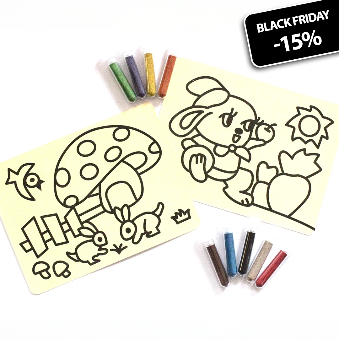 Ar šo aizraujošo komplektu bērni varēs radīt savus unikālos smilšu gleznojumus, kuros attēlots dažādi dzīvnieki, putni un jūras iemītnieki, piemēram: zaķi, dinozauri, zivis, putni vai taureņi u.c. Šis komplekts ir lieliska iespēja bērniem attīstīt savu radošumu un iztēli.